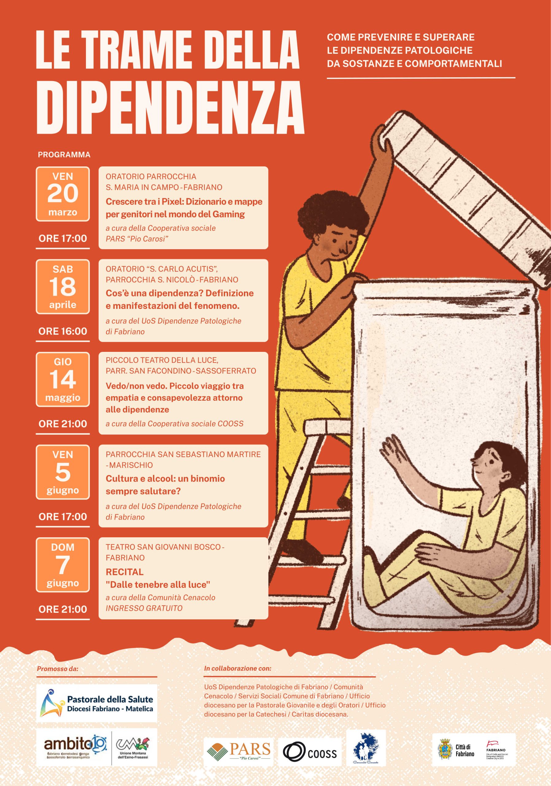Le trame della dipendenza è il titolo di un percorso di carattere educativo e preventivo, rivolto ai genitori, agli educatori e ai giovani, che si articolerà in cinque tappe, da marzo a giugno, in varie parrocchie, promosso e organizzato dall’Ufficio per la Pastorale della Salute della Diocesi Fabriano – Matelica e dall’Ambito Territoriale Sociale 10. Gli incontri saranno tenuti da operatori che lavorano nel campo della cura delle dipendenze patologiche in comunità e sul territorio. Tali dipendenze possono essere di natura fisica e/o psichica, legate cioè all’uso di sostanze psicoattive che alterano lo stato di coscienza (droghe, psicofarmaci, alcool, ecc.) e causano sindrome di astinenza o ad abitudini comportamentali compulsive (sovraesposizione su internet, gaming, gioco d’azzardo, ecc.).